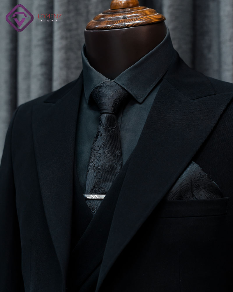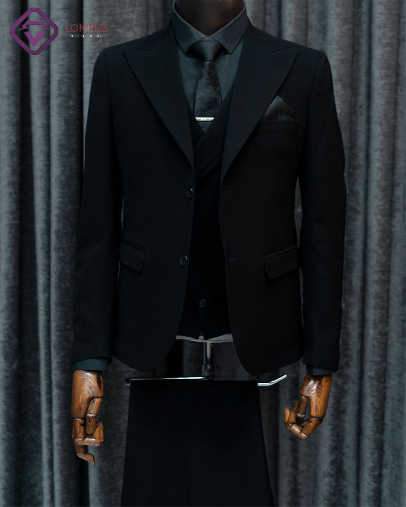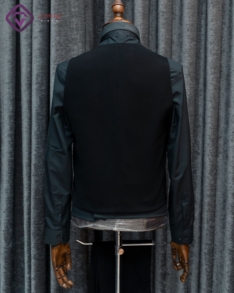 • مدل جلیقه: یقه بلیزر دبل برست اریب پنج دکمه پشت پارچه