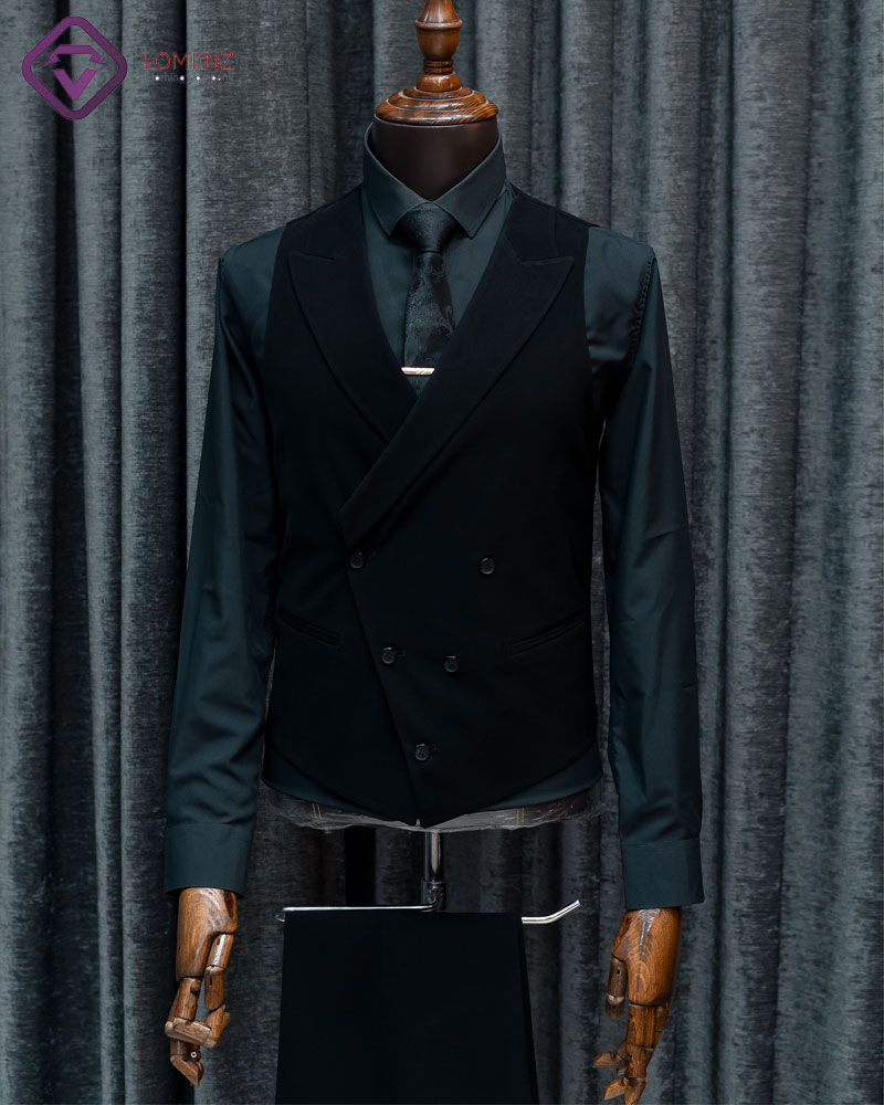 - مدل جلیقه: یقه بلیزر دبل برست اریب پنج دکمه پشت پارچه